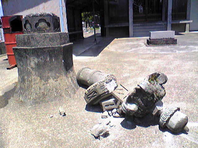 × [PR]上記の広告は3ヶ月以上新規記事投稿のないブログに表示されています。新しい記事を書く事で広告が消えます。 今日は、地震について話そうと思います。 もうTVとかで色々聞いているので勘弁、 という人は見なくてもいいかもしれません。 さて、今日起こりました『岩手・宮城内陸地震』 大きかったですね~。 私の住んでいるところは、震度6弱でしたよ~。 工エエェェ(´゚д゚`)ェェエエ工 って思うかもしれませんね。 自宅にいたんですが、割りと大丈夫でした。 その時間は、二度寝しようと布団をかぶっていた時だったんです。 激しい横揺れで、地震だと気づきました。 とりあえず、そのまま布団をかぶって落下物を防いでいました。 揺れが収まったので、家族と合流してTVを見ると、結構大きな震度だったと。 電話はつながりませんし、余震はたびたび来るし。 散々でしたね。 私の部屋は、地震対策で棚を固定していたので、全然倒れることもなく 上に置いていたぬいぐるみなどの小物が落ちてきた程度でした。 二階は足の踏み場がないくらいに、物が散乱していましたけど。 家を一通り見て、被害が少なかったようなので、墓石も見たほうがいいなと思い、 祖母と一緒に見に行きました。 写真は、その際に撮ったものです。 石塔?が半分から折れて、傘の部分が壊れていましたよ。 私の家の墓石は、五分ほどずれていましたが、他は問題ありません。 それよりも、他の家の灯篭が… 灯篭が倒壊して、散乱していました。 他にも、地蔵?(水子の像)が倒れていたり。 その中には、首が捥げているものも。 これは不吉な感じです。 まぁ、とりあえずこんな感じです。 一部の店とかは、被害が大きかったのか、臨時休業しているところもありました。 あるスーパーでは、入り口の自動ドアが壊れてしまったりしてましたよ。 ちょうどその辺りが隆起しているのが、故障の原因だと思われますが。 この調子で書くと収集がつかなくなりそうなので、 今日はこの辺で。ノシ PR